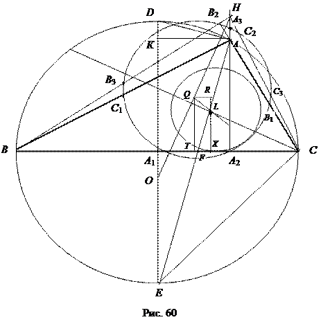 Чтобы доказать касание вписанной окружности и окружности Эйлера, достаточно доказать, что расстояние между их центрами L и Q равна разности радиуса RQ окружности Эйлера и rL вписанной окружности. Из точки Q опустим перпендикуляр ОR на LХ, LХ ^ АВ. Из треугольника QRL найдем QL 2 = QR 2 + RL 2. Поскольку QR = А 1 Х – А 1 Т и RL = QТ – LХ, то QL 2 = (А 1 Х – А 1 Т)2 + (QТ – LХ)2. Докажем, что QТ = Точки А 1, А 3 принадлежат окружности Эйлера, А 1 А 3 – диаметр этой окружности, ОА – радиус описанной окружности. По следствию 1: А 1 А 3 = ОА. Поскольку ОА 1 ||АА 3, то А 1 А 3 АО – параллелограмм. Значит, ОА 1 = АА 3, и ОК = А 2 А 3. Поскольку А 2 и А 3 принадлежат окружности Эйлера, то QА 2 А 3 – равнобедренный треугольник. Значит, QТ = Поэтому QL 2 = (А 1 Х – = А 1 Х 2 + = = = ( = ( Теперь докажем, что А 1 Х ХА 2 = KD LX. Имеем D АКD KD LX = А 1 А 2 ХF (1). Остается доказать, что А 1 А 2 ХF = А 1 Х ХА 2. Имеем D EFC Треугольник LEС – равнобедренный: Ð LCЕ = Ð ELC = Поэтому Вычитая компоненты этого равенства от А 1 А 2 А 1 Х, получим: А 1 А 2 А 1 Х – А 1 F А 1 А 2 = А 1 А 2 А 1 Х – А 1 Х 2 или А 1 А 2 (А 1 Х – А 1 F) =А 1 Х (А 1 А 2 – А 1 Х) или А 1 А 2 (А 1 Х – А 1 F) = А 1 Х ХА 2 или А 1 А 2 ХF = А 1 Х ХА 2. Тогда KD LX = А 1 Х ХА 2 = А 1 А 2 ХF. Теперь равенство (1) можно записать так KD LX = А 1 Х ХА 2. Поэтому QL 2 = ( = (