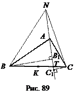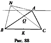 Если в сравниваемых треугольниках NАВ и NАС общую часть – треугольник NАР заменить на треугольник РВС, то соотношения между площадьми исходных треугольников NАВ и NАС и полученных треугольников NВС и АВС будут одинаковыми. Поскольку SNВС.= Пусть точка N опять находится в полосе между l и АВ, N ¹ К, и точка N принадлежит ВС, или одному из отрезков АВ или АС. Тогда очевидно, что SNAB ¹ SNAC. Пусть точка N лежит ниже прямой ВС, причем отрезок АN пересекает отрезок ВС в точке R (рис. 86). Поскольку RВ > RС, то SNBR.= Значит, SNAB = SABR.+ SNBR.> SАСR + SNСR = SNAC. Если точка R совпадает с В или S, то, очевидно, что SNAB = SNAC. Значит, такая точка N не принадлежит искомому ГМТ. Пусть N лежит ниже прямой ВС и отрезок АN не пересекает отрезок ВС. Пусть точка пересечения отрезка АN с прямой ВС принадлежит лучу ВС (рис. 87). В этом случае треугольник NАС является частью треугольника NАВ, поэтому SNAB > SNAC. Значит, такие точки N искомому ГМТ не принадлежат.