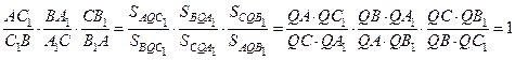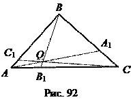 Доказательство. Пусть отрезки АА 1, ВВ 1, СС 1 пересекаются в точке Q (рис. 92). Тогда треугольник АВС делится на 6 треугольных частей. Поскольку к треугольным частям, прилегающим к одной стороне треугольника АВС, можно применить теорему 6, то