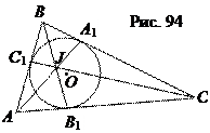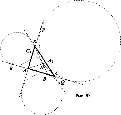 Имеем ВА 1 = ВР = АР – АВ = р – с (рис. 95), поскольку АР = р (следствие 13.1). Аналогично, А 1 С = р – b, СВ 1 = р – а, В 1 А = р – с, АС 1 = р – b, С 1 В = р – а. Поэтому = = 1.