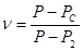 где φ2 – коэффициент скорости, соответствующий выходному сечению. Из уравнения неразрывности W2F2 = WСFС находим WС = W2 Р-РС = Учитывая, что в выражении (32) перед разностью давлений все члены постоянные, обозначим его через ν. Тогда, решая уравнение (32) относительно РС, находим РС = Р2ν – Р(ν – 1) (33) или т.е. коэффициент ν есть отношение действительного перепада давления на расчетном сжатом сечении струи к общему перепаду давления на отверстии. Таким образом, коэффициент ν является характеристикой отверстия. По уравнению (33) в зависимости от Р могут быть получены положительные и отрицательные значения РС. В реальных условиях РС не может быть ниже давления упругости (давления насыщенных паров жидкости при ее температуре Рп), т.е. РС ограничивается кавитационными явлениями. Расход жидкости через насадок определяется уравнением расхода (29). Подставим в это уравнение разность Р-РС из выражения (34), получим