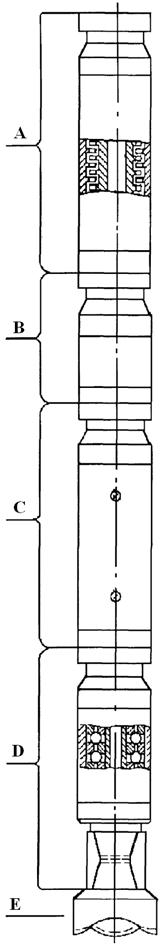 А – турбина; В – опорный узел; С – редуктор-вставка; Д - опорный узел; Е – долото.