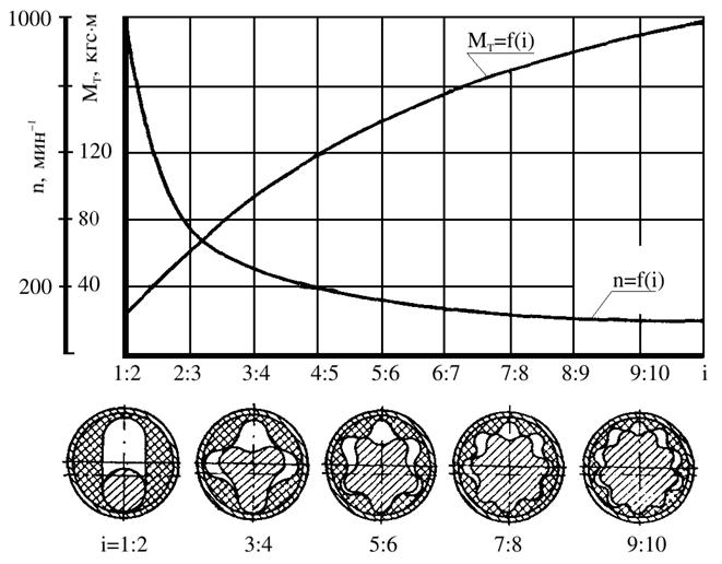 Рис. 2.Зависимость выходных параметров винтовых забойных двигателей (диаметром 172 мм) от кинематического соотношения героторного механизма. (Q=const,Δp=const,Dдв=const)