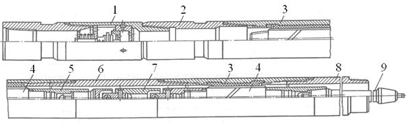 Рисунок 16. Силовая секция двухсекционного двигателя Д1-195 (неориентированная сборка) 1 – переливной клапан; 2 – верхний переводник; 3 – статоры; 4 – роторы; 5 – втулки ротора; 6,8 – переводники; 7 – карданный вал; 9 – гибкий вал.