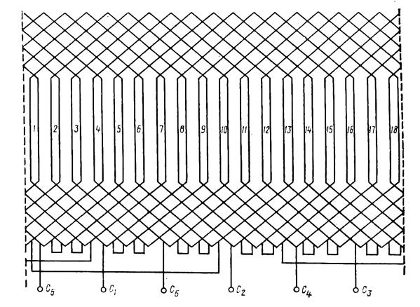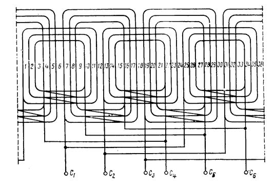 Типы обмоток и общие положения. В асинхронных двигателях с h ≤160 мм обычно выполняют однослойные всыпанные обмотки, а в двигателях с h > 160 мм – двухслойные (из мягких секций или из жестких катушек). В табл. 9-4 указаны типы используемых обмоток и соответственно форма пазов. При выполнении двигателей с однослойными обмотками облегчается применение автоматических обмоточных станков, а при изготовлении их с двухслойными обмотками с укороченным шагом – улучшается форма кривой поля и уменьшается расход меди на лобовые части обмотки. Однослойную обмотку выполняют концентрической. Для механизации обмоточных работ в электродвигателях с h > 160 мм используют разносекционные одно- и двухслойные концентрические обмотки [см. 8; 20]. Высоковольтные электродвигатели выполняют с открытыми пазами. По высоте паза укладывают две катушки, а прямоугольные проводники располагают плашмя. Конструкция обмоток статора описана в § 3-13. На рис. 9-5 показаны схема трехфазной однослойной концентрической обмотки статора, а на рис. 9-6 – схема трехфазной двухслойной петлевой обмотки статора. Обычно обмотку статора выполняют шестизонной; каждая зона равна 60 эл. град.