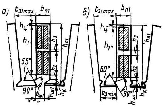 Рекомендуется применять следующие марки проводов прямоугольного сечения: для класса В – ПЭТВП (при U≤ 660 В) и ПЭТВСД (при U = 6000 В); для класса F – ПЭТП-155; для класса Н – ПЭТП-200. Выбор размеров прямоугольных полуоткрытых и открытых пазов и расположенных в них проводов производят в такой последовательности.