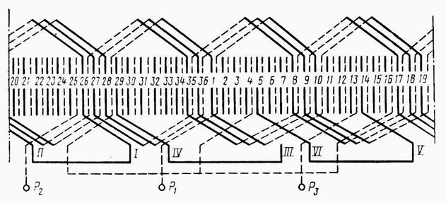 Рис. 9-14. Схема двухслойной волновой обмотки фазного ротор (одной фазы) Z2=36; 2p=4; q2=3;