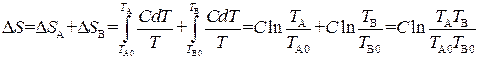 Клаузиус сформулировал второе начало следующим образом: невозможны такие процессы, единственным конечным результатом которых был бы переход тепла от тела менее нагретого к телу более нагретому. Не следует представлять дело так, что второе начало вообще запрещает переход тепла от тела менее нагретого к телу более нагретому. В холодильной машине как раз совершается такой переход. Однако этот переход не является единственным результатом процесса. Он сопровождается изменениями в окружающих телах, связанными с совершением над системой работы A ′. Покажем, что совершаемый в изолированной системе воображаемый процесс, противоречащий второму началу в формулировке Клаузиуса, сопровождается уменьшением энтропии. Тем самым мы докажет эквивалентность формулировки Клаузиуса и статистической формулировки второго начала, согласно которой энтропия изолированной системы не может убывать. Предварительно сделаем следующее замечание. Допустим, что некоторое тело обменивается теплом с другим телом, которое мы будем называть тепловым резервуаром. Пусть теплоемкость резервуара бесконечно велика. Это означает, что получение или отдача резервуаром конечного количества тепла не изменяет его температуры. Протекающий в теле процесс, сопровождающийся обменом теплом с резервуаром, может быть обратим только в том случае, если в ходе этого процесса температура тела будет равна температуре соответствующего резервуара. В самом деле, если, например, тело получает тепло от резервуара с температурой T 1, имея температуру, меньшую чем T 1, то при протекании того же процесса в обратном направлении тело сможет вернуть резервуару полученное от него тепло в том случае, если его температура во всяком случае не ниже чем T 1. Следовательно, при прямом и обратном ходе процесса температура тела будет различна, тело проходит в обоих случаях через различные последовательности состояний (характеризующиеся неодинаковыми температурами), и рассматриваемый процесс будет необратимым. Таким образом, процесс, сопровождающийся теплообменом, может быть необратимым только в том случае, если, получая тепло и возвращая его при обратном ходе резервуару, тело имеет одну и ту же температуру, равную температуре резервуара. Строго говоря, при получении тепла температура тела должна быть на бесконечно малую величину меньше температуры резервуара (иначе тепло не потечет от резервуара к телу), а при отдаче тепла температура тела должна быть на бесконечно малую величину выше температуры резервуара. Следовательно, единственным обратимым процессом, сопровождающимся теплообменом с резервуаром, температура которого остается неизменной, является изотермический процесс, протекающий при температуре резервуара. Рассмотрим изолированную систему, состоящую из двух тел с одинаковой теплоемкостью C. Пусть тело B передает телу A количество тепла Q, в результате чего температура тела A повышается от значения TA0 до TA, а температура тела B уменьшается от значения TB0 до TB ( В ходе указанного процесса происходит теплообмен между телами с неодинаковыми температурами. Согласно сказанному выше такой процесс необратим. Для того чтобы найти изменение энтропии при необратимом процессе, поступают следующим образом. Рассматривают какой-либо обратимый процесс, приводящий систему в то же конечн