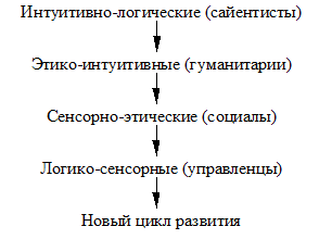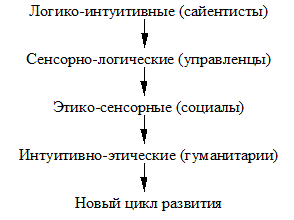 По этой схеме в свою очередь образуются две разновидности триад, так как все типы, соединенные отношением социального заказа, однородны по признаку «экстраверсия — интроверсия». Экстравертные триады постепенного направления: Искатель — Наставник — Политик Наставник — Политик — Управитель Политик — Управитель — Искатель Управитель — Искатель — Наставник Общей характеристикой данных триад, хотя они берут начало и продуцируют результат в любых трех сферах деятельности, является постепенное, но неуклонное расширение своего влияния. Коллектив, состоящий из таких звеньев, уверенно становится на ноги и спокойными темпами наращивает ритм своей активности. Его функционирование во многом подобно той роли, которую играет в организме кровеносная система. Интровертные триады постепенного направления: Критик — Гуманист — Посредник Гуманист — Посредник — Инспектор Посредник — Инспектор — Критик Инспектор — Критик — Гуманист Общий знаменатель данных триад — медленное, но неуклонное совершенствование имеющихся ресурсов и методов труда за счет отсеивания лишнего и вредного. Вряд ли стоит создавать большое количество таких триад, так как они сильно замедляют эволюцию коллектива. В то же время они необходимы для здорового существования зрелых коллективов, так как выполняют в них функцию лимфатической системы — оздоровления и очищения от шлаков и инородных тел. Второе направление движения соцзаказного импульса — против часовой стрелки (см. схему). Такое развитие происходит скачкообразно (вперед, а потом назад), с «перепрыгиванием» препятствий, откатами и внезапными рывками. Последовательность передачи эстафеты такова: