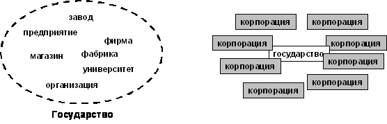 В традиционном, христианском и русском представлении, государство превыше всего и управляет всем. Люди, отдельные фирмы и организации подчиняют свои интересы общим. Поскольку власть денег стремится быть абсолютной и всемирной, в нём государству отводится второстепенная роль, роль полицейского, «оказателя услуг населению» и посредника между денежными интересами.