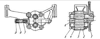 Рис. 11. Масляный насос: 1 — шестерня привода насоса; 2 — корпус насоса; 3 — ведомая шестерня; 4—крышка корпуса; 5—втулки; 6—ведущая шестерня; 7—редукционный клапан; 8—пружина клапана; 9—регулировочные шайбы