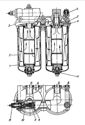 Рис. 12. Масляный фильтр: 1 — колпак фильтра; 2 — фильтрующий элемент; 3 — корпус фильтра; 4—штуцер для датчика давления масла; 5 — замковая крышка; 6 — прокладка колпака; 7 — сливная пробка; 8 — перепускной клапан; 9 — пружина клапана; 10— подвижный контакт; 11 — неподвижный контакт сигнализатора; А — из системы; Б—в систему; В—к датчику давления масла