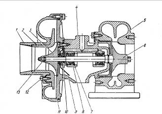 Рис. 24. Турбокомпрессор: 1 — крышка корпуса компрессора; 2 — корпус компрессора; 3 — колесо компрессора; 4 — корпус подшипников; 5 — корпус турбины; 6 — колесо турбины; 7 — стопорное кольцо; 8 — втулка подшипника; 9 — маслосбрасывающий экран;10 — упорный подшипник; 11 — крышка корпуса подшипников; 12 — винт; 13 — гайка креп- ления колеса компрессора