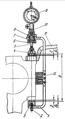Степень затяжки шатунных болтов рекомендуется контролировать величиной их удлинения, которая должна быть в пределах 0,32—0,34 мм от первоначальной длины болта. Для контроля величины удлинения нужно использовать специальное приспособление, показанное на рис. 44.