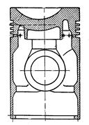 Поршневая группа состоит из поршня, поршневых колец, поршневого пальца, деталей для удержания пальца от осевого перемещения, крепежных деталей. Поршень, относящийся к числу наиболее ответственных и напряженных деталей двигателя, выполняет следующие функции: 1. обеспечивает требуемую форму камеры сгорания и герметичность внутрицилиндрового пространства; 2. передает силу давления газов на шатун и стенку цилиндра; 3. управляет открытием и закрытием окон (выполняет функции распределительного устройства) в двухтактных двигателях со щелевой схемой газообмена. На поршень действуют механические нагрузки от давления газов и сил инерции, а также высокие тепловые нагрузки в период непосредственного соприкосновения его с горячими газами при сгорании топлива и расширении продуктов сгорания. Дополнительно поршень нагревается от трения о стенки цилиндра. При перегреве поршня понижаются механические свойства его материала и возрастают термические напряжения в нем. Кроме того, в этом случае ухудшается наполнение цилиндра свежим зарядом, что ведет к уменьшению мощности двигателя, возможно заклинивание поршня в цилиндре, ухудшается работа кольцевого уплотнения, а также появляются преждевременные вспышки или детонационное сгорание в двигателях с внешним смесеобразованием. Поршни двигателей внутреннего сгорания наряду с достаточной прочностью и жесткостью должны иметь меньшую массу для уменьшения сил инерции, обладать высокой теплопроводностью и износостойкостью. Основными элементами поршня являются днище и боковые стенки. Боковые стенки образуют уплотняющую (верхнюю) и направляющую (нижнюю) части. Днище вместе с уплотняющей частью образуют головку поршня, а направляющую (тронковую) часть называют юбкой поршня. На рис. 1.10.а показана конструкция поршня дизельного двигателя. Поршень имеет форму стакана, форма днища которого определяет форму камеры сгорания. Днище воспринимает давление газов и поэтому должно быть весьма прочным. Форма днища должна соответствовать форме и расположению струй топлива, впрыскиваемого в камеру сгорания. В двигателях с внешним смесеобразованием и относительно невысокой степенью сжатия наиболее распространен поршень с плоским днищем (рис. 1.10.б). В двухтактных двигателях со щелевой схемой газообмена днищу придают форму, которая способствует созданию нужного направления движения продувочного воздуха. На наружной поверхности в головке поршня имеются канавки для поршневых колец, служащих для уплотнения цилиндра от прорыва газов и попадания смазки из картера в камеру сгорания. На внутренней поверхности юбки поршня имеются бобышки с отверстиями для установки поршневого пальца. Для изготовления поршней используют чугун, алюминиевые и магниевые сплавы, а также сталь. Большей частью поршни делают из чугуна и алюминиевых сплавов. Чугунные поршни отличаются высокими прочностью и износостойкостью и малым коэффициентом линейного расширения, но имеют большую массу.