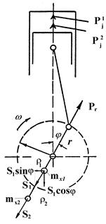 Рис. 1.30. Неполное уравновешивание одноцилиндрового двигателя Центробежная сила вращающихся масс Рr может быть полностью уравновешена установкой противовесов массой тх2 на радиусе? 2 продолжения щек коленчатого вала (рис. 1.30). Масса каждого из противовесов находится из уравнения: