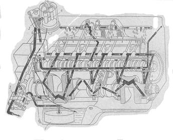 Рис. 4.1. Классификация систем смазки Рассмотренная система смазки относится к системам смазки с мокрым картером. Такое название эти системы получили потому, что резервуаром для основного количества масла является нижняя часть картера двигателя. В некоторых форсированных автомобильных двигателях для обеспечения надежной смазки при любом положении двигателя, а также для борьбы с пенообразованием в картере применяют системы смазки с сухим картером. В этих системах стекающее в картер масло отсасывается из него специальными насосами в расположенный снаружи двигателя промежуточный масляный бак, где оно отстаивается от пены. Из промежуточного бака масло подается насосом в нагнетающий маслопровод двигателя. Очистка масла от пены необходима для обеспечения нормальной работы двигателя, так как при поступлении в масляный насос пены подача масла последним уменьшается. При комбинированной системе смазки, применяемой в подавляющем большинстве современных автомобильных и тракторных двигателей, используют как первый, так и второй способы подвода масла. Обычно под давлением, создаваемым масляным насосом, смазываются лишь наиболее ответственные трущиеся детали двигателя – подшипники коленчатого и распределительного валов. Во многих двигателях под давлением также смазываются распределительные шестерни, поршневые пальцы, толкатели и др. Остальные трущиеся детали смазывают разбрызгиванием и самотеком. В большинстве современных автомобильных и тракторных двигателей подвергаются обильной смазке нижняя часть зеркала цилиндра и кулачки распределительного вала. Смазка осуществляется струями масла, вытекающими через направляющее отверстие в кривошипной головке шатуна при совпадении его с выходным отверстием в шатунной шейке. Для увеличения срока службы масла и уменьшения износа трущихся деталей в большинстве двигателей устанавливают фильтры грубой и тонкой очистки масла. С этой же целью масло из картера двигателя забирается через плавающий маслоприемник из верхнего, наименее загрязненного тяжелыми примесями слоя. В двигателях с напряженным режимом работы, главным образом двигателях грузовых автомобилей и тракторов, применяются радиаторы для охлаждения масла. Необходимое давление в нагнетающей магистрали поддерживается редукционными клапанами. На рис. 4.2 показана схема комбинированной системы смазки двигателя. Эта система состоит из следующих узлов: неподвижного, маслоприемного фильтра 1, масляного насоса 2, маслопроводов, пластинчатого фильтра грубой очистки 3, центробежного фильтра тонкой очистки 4, редукционного и перепускного клапанов, маслоналивного патрубка и трубки для подачи масла в радиатор. В двигателе, кроме подшипников коленчатого и распределительного валов, принудительно смазываются опоры промежуточного валика привода распределителя зажигания, масляного насоса, толкатели. Втулки коромысел смазываются пульсирующим потоком масла. К остальным трущимся деталям масло поступает самотеком и при разбрызгивании.