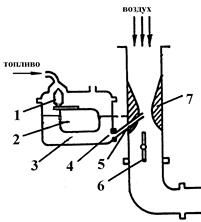 Схема элементарного карбюратора показана на рис. 5.4. Топливо из бака поступает по топливопроводу в поплавковую камеру 3 карбюратора. В поплавковой камере плавает пустотелый поплавок 2. На поплавок опирается запорная игла 1, пропускающая топливо в камеру при понижении уровня и прекращающая доступ топлива, когда уровень достиг необходимой высоты. Поплавковая камера через воздушное отверстие сообщается с атмосферой, в связи с чем в камере поддерживается атмосферное давление. Из поплавковой камеры через калиброванное отверстие, называемое жиклером 4, топливо поступает в распылитель 5. Выходное отверстие распылителя размещено в горловине диффузора 7, на 5–6 мм выше уровня топлива в поплавковой камере. Воздух поступает в карбюратор через воздухоочиститель. При прохождении через диффузор скорость воздушного потока возрастает, а давление в диффузоре падает. Истечение топлива из распылителя происходит под действием разности давлений в поплавковой камере (атмосферное давление) и горловине диффузора (разрежение). Скорость потока воздуха, проходящего через горловину диффузора, значительно превышает скорость топлива, истекающего из распылителя. При истечении из распылителя топливо распыливается потоком воздуха, частично испаряется и, перемешиваясь в смесительной камере с воздухом, образует горючую смесь.