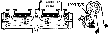 В тех же 70-х годах стало ясно, что добиться существенного улучшения ситуации с токсичностью без применения дополнительных устройств невозможно, поскольку уменьшение одного параметра влечет увеличение других. Поэтому активно занялись совершенствованием систем нейтрализации отработавших газов. Системы нейтрализации применялись и ранее для автотракторной техники, работающей в особых условиях, например на прокладке туннелей и разработке шахт. Существует два основных принципа построения нейтрализаторов – термический и каталитический. Термический нейтрализатор представляет собой камеру сгорания, которая размещается в выпускном тракте двигателя для дожигания продуктов неполного сгорания топлива – СН и СО. Он может устанавливаться на месте выпускного трубопровода и выполнять его функции. Реакции окисления СО и СН протекают достаточно быстро при температуре свыше 830 °С и при наличии в зоне реакций несвязанного кислорода. Термические нейтрализаторы применяются на двигателях с принудительным воспламенением, в которых необходимая для эффективного протекания термических реакций окисления температура обеспечивается без подачи дополнительного топлива. И без того высокая температура выпускных газов у этих двигателей повышается в зоне реакции в результате догорания части СН и СО, концентрация которых значительно выше, чем у дизелей. Термический нейтрализатор (рис. 10.4) состоит из корпуса с подводящими (выпускными) патрубками и одной или двух жаровых труб-вставок из жаропрочной листовой стали. Хорошее перемешивание дополнительного воздуха, необходимого для окисления СН и СО, с выпускными газами достигается интенсивным вихреобразованием и турбулизацией газов при перетекании через отверстия в трубах и в результате изменения направления их движения системой перегородок. Для эффективного догорания СО и СН требуется достаточно большое время, поэтому скорость газов в нейтрализаторе задается невысокой, вследствие чего объем его получается сравнительно большим.