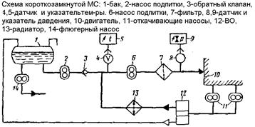 Основные магистрали двухконтурной масляной системы аналогичны одноконтурной. Различие этих систем состоит в том, что у двухконтурной системы имеется подкачивающий насос (насос подпитки) и два контура течения масла: основной и дополнительный. По основному контуру (нагнетающий насос-двигатель-откачивающие насосы-центрифуга-радиатор-нагнетающий насос) циркулирует до 90% прокачиваемого масла и лишь 10% проходит для подогрева через дополнительный контур (радиатор — масляный бак — подкачивающий насос). При этом через центрифугу и радиатор проходит все масло, прокачиваемое через двигатель. По дополнительному контуру масло направляется в бак лишь после выхода его из радиатора. Диаметр жиклера в дополнительном контуре подбирают из расчета отвода по нему наивыгоднейшего количества масла. Это и расходуемое, при работе двигателя масло поступает из бака в основной контур (на вход в нагнетающий насос) при помощи подкачивающего насоса. Вследствие того, что через двигатель циркулирует не все масло, находящееся в баке, ускоряется его прогрев, сокращается время подготовки летательного аппарата к полету. Вторым преимуществом этой системы является возможность получения большей высотности, чем при одноконтурной. Увеличение высотности достигается установкой во всасывающей магистрали подкачивающего насоса, поддерживающего перед нагнетающим насосом определенное избыточное давление, благодаря чему исключается образование на входе в насос воздушных пробок.