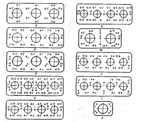Рисунок 4. Послідовність затягування гайок головки циліндрів: а-ЯМЗ-236НБ; б – СМД-60; в – А-01М; г – А-41; д – Д-65Н; е – Д-37Е, Д-37М, Д-144; ж – Д-21; з – Д-108, СМД-14; і – Д-50, Д-240; к – пускових двигунів ПД-10У та П-350. Встановлення головки циліндрів і клапанного механізму. Протирають при-валкові площини блок-картера і головки циліндрів, встановлюють прокладку широким боком обкантовки на поверхню блок-картера, змастивши її з двох боків герметиком або графітовою пастою СК-26-13. У кожний циліндр перед встановленням головки циліндрів заливають по ЗО г моторного масла. Гайки кріплення циліндрів затягують у певній послідовності (рис. 4) за кілька заходів. За один прийом гайки затягують не більше, як на дві грані. Остаточно їх затягують динамометричним ключем ОРГ-8928 моментами, які відповідають наведеним в табл. 14.