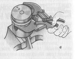 16. Перевірте справність резинових кілець гільзи циліндрів і вставте їх в канавки гільзи. Встановіть гільзу в блок; її бурт повинен виступати над площиною блока на 0,06...0,16 мм. 17. Поверніть блок картером вверх, а шестерню розподільчого вала – міткою в сторону підшипника колінчатого вала. Покладіть колінчатий вал в постіль блока так, щоб мітки на шестернях обох валів співпадали. Кришки корінних підшипників поставте на шпильки. На штифти кришки заднього корінного підшипника попередньо поставте упорні полукільця. Посадіть легкими ударами молотка через виколотку всі кришки, а потім накрутіть на шпильки гайки. Затягніть гайки динамометричним ключем. Момент затяжки – 260...280 Н.м. Вкрутіть в блок бокові стяжні болти кришок. При збиранні робочого дизеля перед встановленням розподільчого та колінчатого валів стиснутим повітрям продувають канали, що підводять масло до їх підшипників; витирають та змащують моторним маслом шийки валів. Перед накручуванням гайок різьбу шпильок теж змащують маслом. Перед затяжкою гайок заднього корінного підшипника вал переміщують в межах зазору (щоб він був однаковим з обох боків кришки упорного підшипника; зазор перевіряють щупом). 18. Встановіть картер маховика і маховик, а також передню кришку блок – картера. 19. З’єднайте шатуни з поршнями. Для правого ряду циліндрів стрілка на поршні та паз уступу вкладиша на шатуні повинні розташовуватись по одну сторону, а для лівого – в протилежні сторони. Перед встановленням поршневого пальця вкладіть в бобику поршня стопорне кільце, потім ударами молотка через виколотку введіть поршневий палець в бобики і верхню головку шатуна до упора в стопорне кільце, після чого встановіть друге стопорне кільце. Для робочого дизеля перед встановленням пальця поршень нагрівають в масляній ванні до температури 60...70 0С, а палець змащують моторним маслом. 20. Встановіть на поршень розширювач маслоз’ємних кілець. За допомогою пристрою встановіть на поршень одне широке або два вузьких скребкових маслоз’ємних кільця, потім компресійне скребкове кільце, середнє кільце і верхнє хромовані (клеймом “вверх” до днища поршня). Кільця, встановлені на робочий поршень, повинні входити в канавки без відчутного зазору. При обертанні горизонтально розташованого поршня компресійні кільця повинні плавно переміщуватись в канавках і потопати в них під дією власної ваги, а маслоз’ємне - при легкому натисканні на нього. 21. Розставте замки поршневих кілець на рівній відстані один від другого, але не напроти бобишек поршня. 22. Поставте на юбку поршня пристрій для обжимання кілець (див. рисунок 8). Обережно введіть в циліндр шатун з поршнем до упору пристрою в бурт гільзи і, натискаючи на поршень, введіть його в гільзу до виходу з пристрою.