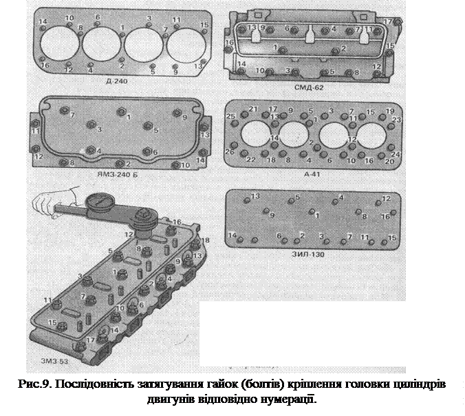 При встановленні поршнів з шатунами простежте, щоб широка сторона нижньої головки шатуна прилягала до щоки колінчатого вала, а стрілки на днищах поршнів були направлені в сторону носка цього валу. Поставте головку шатуна на шийку вала і приєднайте кришку шатуна так, щоб штифт попав в паз кришки. На робочому дизелі перед цим протирають вкладиші шатуна та шийку вала чистою салфеткою, верхній вкладиш встановлюють з натягом ударами мідного молотка в торець, потім змащують вкладиші та шатунну шийку вала моторним маслом. Затягніть шатунні болти рівномірно за два підходи. Момент кінцевої затяжки – 240...260 Н.м. Встановіть масляний насос, маслоприймач та піддон картера. 23. За допомогою пристрою (див. рисунок 7) зберіть на головці циліндрів клапанний механізм. 24. Покладіть на площину блока прокладку широкою окантовкою вниз і поставте головку циліндрів на шпильки. Накрутіть всі гайки її кріплення і затягніть їх в два підходи динамометричним ключем в послідовності, що показана на рисунку 9. Момент кінцевої затяжки - 220...240 Н.м. В такій же послідовності встановіть другу головку циліндрів. 25. Встановіть випускні трубопроводи, встановіть штанги, стійки коромисел в зборі з віссю і коромислами. 26. Встановіть ковпаки головок циліндрів. 27. Дайте висновок про технічний стан, комплектацію двигуна та заповніть журнал.
