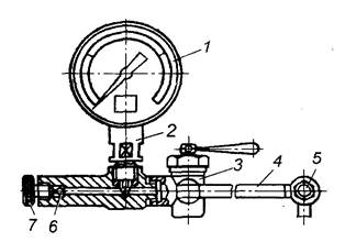 Рис. Устройство КИ-4801: 1 — манометр; 2 — корпус; 3 — трехходовой кран; 4— шланг; 5— пустотелый болт (штуцер); 6 — клапан; 7— винт Если давление увеличилось, снятый клапан регулируют или заменяют. Если давление остается прежним, это свидетельствует о засорении фильтрующих элементов фильтра тонкой очистки. При равенстве или небольшой разнице давлений до и после фильтра тонкой очистки топлива следует его разобрать и проверить состояние уплотнений и фильтрующих элементов. Date: 2015-05-05; view: 2239; Нарушение авторских прав |
