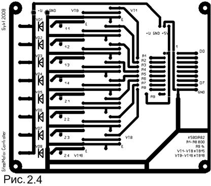 Мной была разработана и изготовлена печатная плата адаптера (Рис.2.4) по схеме рис.2.3, с использованием микросхемы К580ИР82. Микросхема К580ИР82 – восьмиразрядный буферный регистр. Номера используемых выводов микросхемы указаны в скобках, цепь с резистором R2 не требуется.