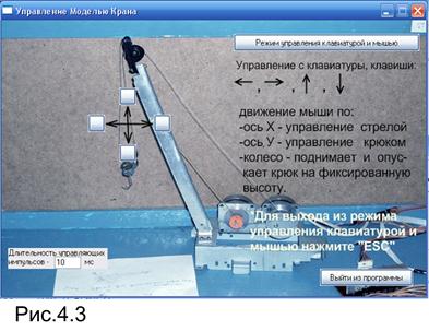 Окно программы представлено на рисунке 4.3. Программа позволяет управлять моделью при помощи кнопок, стрелки указывают на направление перемещения крючка. Для подстройки программы предусмотрено изменение длительности импульсов, управляющих моделью. Реализован режим управления моделью с помощью клавиатуры и мыши. В этом режиме программа отслеживает перемещение мыши, нажатые клавиши на клавиатуре и мыши. Алгоритм управления шаговыми двигателями модели крана был описан в [1] и показан на рисунке 4.4. Текст программы представлен в приложении 4.