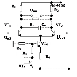 Большинство схем не может использоваться для усиления сигналов постоянного тока (при fгр.н. → 0), т.к. почти все они требуют задания постоянного смещения помимо сигнала, а стабильность постоянного уровня напряжения покоя на их выходах сравнительно низка.В то же время при усилении сигналов постоянного тока невозможно отделить сигнал от смещения, и поэтому нужны схемы с высокой стабильностью выходного напряжения, допускающие «смещение сигналом». Решение этой проблемы нашло отражение в дифференциальном каскаде,схема которого показана на рис.1 Здесь два идентичных транзистора имеют общий источник «вытекающего» эмиттерного тока смещения и одинаковые коллекторные нагрузки R1 и R2, разность падений напряжений на которых и является выходным сигналом. Входной сигнал задаётся как напряжение между входами Uвх. = Uвх.1 – Uвх.2. Если Uвх.1 = Uвх.2 = Uвх.синф., т.е на оба входа подано одинаковое синфазное напряжение, то идентичные транзисторы будут иметь равные напряжения Uб э и равные токи Iэ 1 = Iэ 2 = Iэ см./ 2. При этом должно соблюдаться условие Iк 1 R1 = Iк 2 R2 ≤ Е1 – Uвх. синф., поскольку в противном случае транзисторы насытятся и выйдут из линейного режима.В силу равенства токов Iк 1 = Iк 2 и выходное напряжение Uвых.= Iк 1 R1 – Iк 2 R2, будет равно нулю во всём допустимом диапазоне синфазных напряжений. Этот диапазон ограничен снизу значением Е2 + Uб э + + Uсм. min, где Uсм. min – минимальное падение напряжения, необходимое источнику тока Iэ см. ддя функционирования с высоким Rвых. Все виды синфазных (т.е. действующих на оба плеча каскада одновременно и одинаково) воздействий не будут приводить к изменениям Uвых. Это относится к изменениям напряжения питания нестабильности Iэ см., температурному дрейфу Uб э транзисторов и сопротивлений резисторов R1 и R2 при условии точного равенства температур и характеристик компонентов.