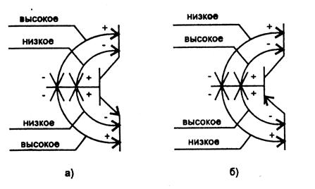 Работоспособность биполярных транзисторов можно проверить при помощи омметра, путем измерения величины сопротивления между базой и эмиттером, базой и коллектором в обоих направлениях. Это объясняется тем, что транзистор можно представить в виде эквивалентной схемы, представляющей собой два диода, включенных навстречу один другому. Для р-n-р транзисторов диоды соединены катодами, а для n-p-n транзисторов — анодами. Таким образом, проверка транзистора омметром сводится к проверке обоих р-n переходов транзистора: коллектор — база и эмиттер — база. Для проверки прямого сопротивления переходов р-n-р транзистора минусовой вывод омметра подключается к базе, а плюсовой вывод омметра — поочередно к коллектору и эмиттеру. Для проверки обратного сопротивления переходов к базе подключается плюсовой вывод омметра. При проверке n-p-n транзисторов подключение производится наоборот: прямое сопротивление измеряется при соединении с базой плюсового вывода омметра, а обратное сопротивление — при соединении с базой минусового вывода. Значения величин сопротивлений по принципу "низкое"/"высокое" показаны на рисунке 1.