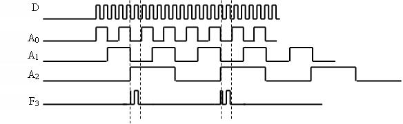 Решение: Демультиплексор выполняет функцию, обратную мультиплексору, т.е. в соответствии с принятой адресацией Ai направляет информацию с единственного входа D на один из M выходов Fj. При этом на остальных выходах будут логические нули (единицы). Принцип работы демультиплексора «из 1 в 4» иллюстрируется таблицей истинности: Таблица 2 Таблица истинности