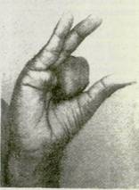 15. Согните указательный и средний пальцы и расположите их кончики в углублении ладони (фот, 124). Это обеспечивает правильное положение кончиков безымянного пальца и мизинца напротив кончика большого пальца, создавая пространство между ними и большим пальцем. Это положение делает ладонь мягкой.