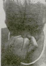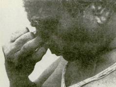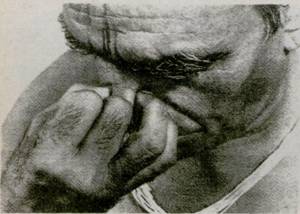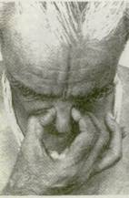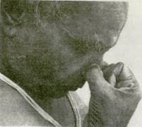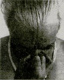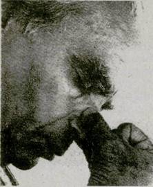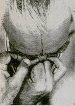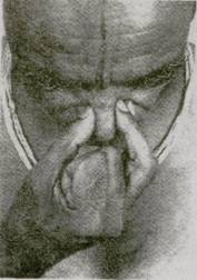 22. Не защемляйте и не раздражайте нос (фот. 135), не нарушайте положение носовой перегородки (фот. 136) Это не только нарушает поток дыхания через ноздри, но также заставляет подбородок склоняться к ущемленной стороне. Не делайте пальцами резких движений. Они должны быть чуткими и в то же время достаточно подвижными, чтобы правильно отрегулировать расширение или сужение носовых проходов. 23. Когда в слизистой ощущается сухость или раздражение, ослабьте нажатие пальцев, не теряя контакта, который способствует току крови. Это сохранит кожу носа и кончиков пальцев свежими, чистыми и восприимчивыми. Иногда, если кожа влажная, можно оттянуть вниз левой рукой наружную кожу носа (фот. 137 и 138) 24. Следите, чтобы подбородок не двигался вправо, когда вы поднимаете руку к ноздрям
