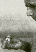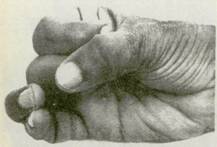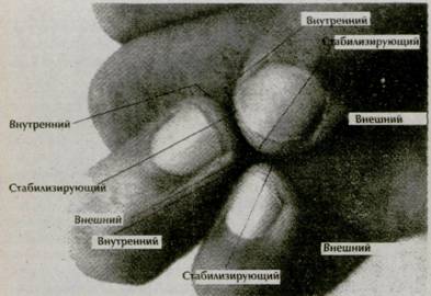 16. Индивидуальная ширина кончиков мизинца и безымянного пальца гораздо меньшая, чем у большого пальца Чтобы уравнять их, согните два пальца навстречу большому, соедините их кончики, сохраняя пространство между суставами (фот. 125), Если это трудно сделать, расположите между суставами округлый предмет, например, пробку, шириной около полудюйма (фот. 126). Таким образом пальцы будут привыкать к новому положению. Центр большого пальца должен находиться напротив соединенных концов двух пальцев (фот. 127). Обычно кожа кончика большого пальца жестче и толще, чем у других Поэтому большим пальцем следует надавливать легче, чем другими, с тем чтобы нажатие было мягким,
