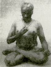 В духовых инструментах довольно много отверстий, в носу же их только два, поэтому от садхаки требуется большее, чем от флейтиста мастерство чтобы управлять бесконечно тонкими и нежными интонациями и оттенками своего дыхания. Хороший музыкант изучает строение, форму, составные части и другие характеристики своего инструмента, а также атмосферные изменения, влияющие на него. Постоянным упражнением пальцев он достигает их виртуозности в таких движениях, в то время как его ухо улавливает малейшие отклонения звука, и он учится координировать искусность пальцев со слухом. Только после этого он может начать овладевать мелодией-ладом, высотой звука, резонансом и ритмом, Садхака также изучает форму и строение ноздрей, структуру наружной кожи, специфические особенности своего носа, такие как ширина носовых проходов, отклонение перегородки и т. п., а также атмосферные явления, влияющие на качество кожи и сухость носовых проходов или что-либо иное. Он регулярно практикует движения запястий и пальцев до тех пор, пока не овладеет ими и не станет способным к их усовершенствованию. Он выверяет расположение кончиков пальцев на коже носа, покрывающей места расположения пяти элементов (земли, воды, огня, воздуха и эфира) в ноздрях. Эти пять местоположений работают как клапаны духового инструмента. Они регулируют поток, ритм и резонанс дыхания посредством сужения или расширения носовых проходов в этих точках осторожным и чутким нажатием пальцев и внимательным вслушиванием в звук дыхания, который садхака модулирует и корректирует. Стражи святилища храма (дварапала) регулируют поток паломников, а пальцы — силу и ток дыхания, и сужением носовых проходов отфильтровывают воздушные примеси во время дыхания, Благодаря регулируемому вдоху через суженные носовые проходы, легкие получают больше времени на всасывание кислорода, а в регулируемом выдохе неиспользованный кислород всасывается повторно, а отработанная материя выбрасывается. Сужением носовых проходов посредством пальцевого контроля садхака развивает большую восприимчивость и осознанность действий. Практикуя удджайи и вилома пранаямы, садхака углубляет свое знание пранаямы, а его тело извлекает практические знания из того, что он испытал В практике Пранаямы при помощи пальцевого контроля он объединяет теоретические и практические знания. Эта координация воспламеняет его знание, пока оно не запылает огнем разума, который полон решимости и энергии (вьявасайятмика буддхи -vyavasayatmika buddhi). 8. Пранаяму можно разделить на две крупные категории: а) отсутствует пальцевой контроль ноздрей; б) большой палец и два пальца правой руки используются для регулирования потока дыхания через нос. Это называется праная-ма, контролируемая пальцами. Кроме того, эта пранаяма подразделяется на два вида: 1) Вдох и выдох выполняется через обе ноздри, частично зажимаемые, с целью освоить использование давления и баланса большого и других пальцев для получения равномерного потока дыхания через обе ноздри (фот. 110). 2) Одна ноздря заблокирована кончиками пальцев, и дыхание вынуждено течь через ноздрю, на которой располагается большой палец, и наоборот. Например, если дыхание проходит через правую сторону, безымянный палец и мизинец должны закрывать левую ноздрю, не нарушая положения носовой перегородки (фот. 