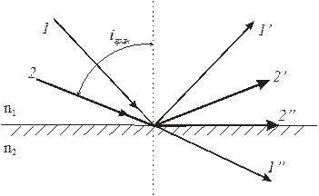При переході світла із середовища з більшим показником заломлення n1 (оптично більш густого) в середовище з меншим показником n2 (оптично менш густе) одержуємо: sin r/ sin i = n1/n2 >1, (1) Заломлений промінь віддаляється від перпендикуляра. Із збільшенням кута падіння (і) зростає кут заломлення (r > і)/ Коли кут падіння досягне деякого граничного значення ігран, що визначається з умови: sin i гран. = n2/n1 = n21, (2) sin r = 1, оскільки r= π/2 і заломлений кут направлений вздовж грані розділу (рис.1).