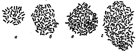 Рис.11.2. Растения и наборы хромосом в соматических клетках Solanum nigrum: а—г: 36, 72, 108 и 144 хромосомы