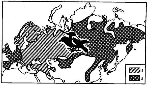 Рис. 11.3. Сниженная жизнеспособность гибридов как фактор разделения популяций серой и черной ворон: 1 — ареал серой вороны, 2 — ареал черной вороны Date: 2015-04-23; view: 733; Нарушение авторских прав |