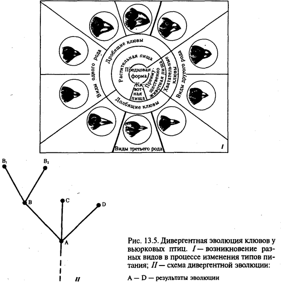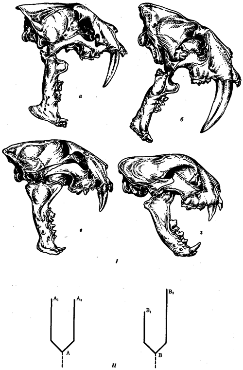 Рис. 13.7. Параллельная эволюция саблезубости у кошачьих. I— черепа саблезубых кошек в разные периоды кайнозойской эры; II— схемы параллельной эволюции: а— махайрод (олигоцен - 37-25 млн. лет назад), б— смилодон (миоцен - 25-9 млн. лет назад) в— лжесаблезубая кошка (олигоцен - 37-25 млн. лет назад), г — саблезубый тигр (плейстоцен — 1,8 млн.-10 тыс. лет назад); А-А2 — этапы синхронного параллелизма, B-B2 - этапы асинхронного Date: 2015-04-23; view: 647; Нарушение авторских прав |