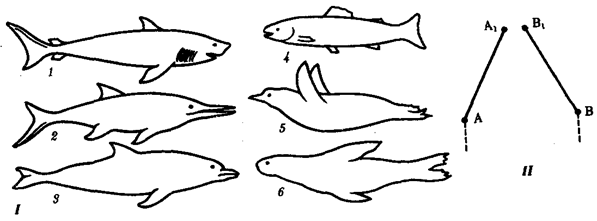 Рис. 13.6. Конвергентная эволюция формы тела позвоночных. I —водные животные разного происхождения; II —схема конвергентной эволюции: 1— акула, 2—ихтиозавр, 3— дельфин, 4— костистая рыба, 5— пингвин, 6— тюлень; A—A1, B—B1 — этапы эволюции