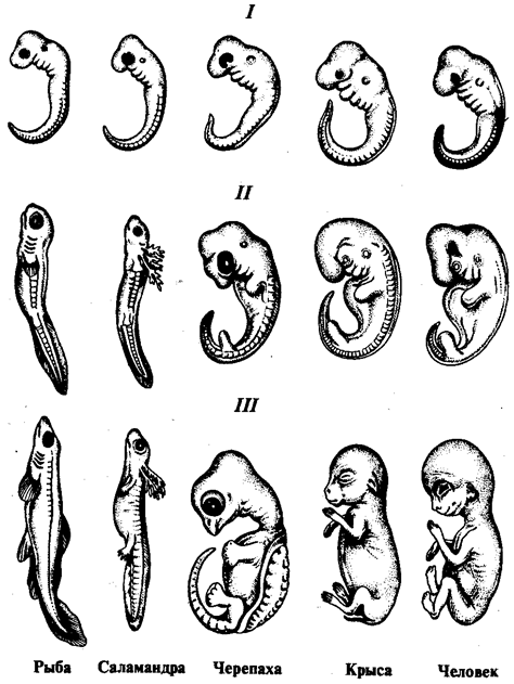 Рис. 13.8. Сходство зародышей разных классов позвоночных на разных этапах (I—Ill) онтогенеза