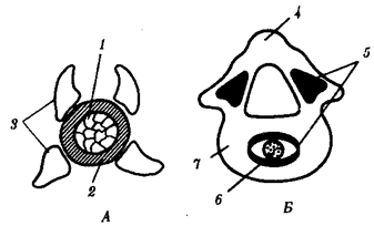 Рис. 14.6. Развитие позвонка. А—ранний этап; Б— последующая стадия: 1 —хорда, 2— оболочка хорды, 3— верхние и нижние позвонковые дуги, 4— остистый отросток, 5— зоны окостенения, 6—рудимент хорды, 7 — хрящевое тело позвонка