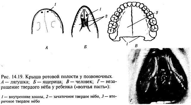 Рассмотрим вначале эволюцию ротовой полости и ее производных. У бесчерепных ротовая полость окружена предротовой воронкой со щупальцами и частично выстлана мерцательным эпителием, который вместе с таким же эпителием глотки создает постоянный ток воды в кишечную трубку, несущую пищевые частицы и кислород. Ротовое отверстие позвоночных окружено кожными складками — губами, которые становятся подвижными только у сумчатых и плацентарных млекопитающих в связи со вскармливанием детенышей молоком. Крыша ротовой полости образована у рыб и земноводных основанием мозгового черепа, которое является первичным твердым нёбом. Хоаны земноводных открываются в их ротовую полость сразу позади альвеолярной дуги верхней челюсти. У пресмыкающихся объем ротовой полости увеличивается, и на верхнечелюстных и нёбных костях появляются горизонтальные складки, частично разделяющие ее на верхний, дыхательный, отдел и вторичную ротовую полость. Хоаны при этом несколько смещаются кзади. У млекопитающих наблюдается срастание этих складок по средней линии таким образом, что возникает сплошное вторичное твердое нёбо, полностью отделяющее друг от друга ротовую полость и полость носа. Хоаны при этом открываются в носоглотку. Этим достигается независимость функций органов ротовой полости от процесса дыхания (рис. 14.19, А— В). До 7-й недели эмбрионального развития человека дифференцировка области stomodeum отсутствует. К концу 8-й недели происходит формирование вторичного твердого нёба за счет срастания горизонтальных костных складок. При нарушении адгезии клеток обеих складок возможно незаращение твердого нёба — порок развития, известный под названием волчья пасть (рис. 14.19, Г). Эта аномалия имеет атавистическую природу. Доказаны генетические механизмы ее возникновения. Она сопровождает ряд хромосомных синдромов, а также наследуется изолированно, причем с разной частотой у населения разных популяций. Так, в Японии частота «волчьей пасти» равна 2,1, а в Нигерии — 0,4 случая на 1000 рождений.