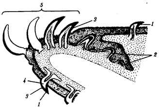 Рис. 14.20. Переход от плакоидной чешуи к зубам по краю ротового отверстия акулы: 1 — плакоидная чешуя, 2— закладка новых зубов, 3— эмаль, 4— дентин, 5— зубы Зубы млекопитающих дифференцированы на резцы, клыки и коренные. Они выполняют различные функции. Такую зубную систему называют гетеродонтной. Если резцы, и в особенности клыки, млекопитающих еще весьма сходны с коническими зубами предков, то наибольшим эволюционным преобразованиям подверглись коренные зубы. Впервые они вознили у зверозубых ящеров начала мезозойской эры за счет расширения оснований зубов и появления дополнительных бугорков, а затем и увеличения жевательных поверхностей при их сглаживании. Общее количество зубов у млекопитающих уменьшается и достигает у высших приматов 32. Зубы располагаются только на альвеолярных дугах челюстей, в ячейках. Основание зуба сужается, образуя корень. Зубы человека по сравнению с другими приматами уменьшены в размерах, особенно клыки. Моляры имеют четырехбугорчатое строение. Зубная дуга округлой формы. В связи с дифференцировкой зубов увеличилась продолжительность их функционирования, в результате чего в онтогенезе сменяются только два их поколения: молочные и коренные. Это явление называют дифиодонтизмом. У человека возможны атавистические аномалии зубной системы, связанные с нарушениями как дифференцировки зубов, так и с их количеством. Редкой аномалией является гомодонтная зубная система, в которой все зубы имеют коническую форму. Более частой патологией является трехбугорчатое строение коренных зубов. Нередко встречается прорезывание сверхкомплектных зубов в ряду или за его пределами, иногда даже на твердом нёбе (рис. 14. 21). Это свидетельствует о том, что у человека возможно образование большего количества зубных зачатков, чем 32, как это в норме встречается у низших млекопитающих и представителей более отдаленных классов позвоночных. Свидетельством тенденции к дальнейшему уменьшению количества зубов у человека является то, что нередко последние коренные зубы, так называемые «зубы мудрости», вообще не прорезываются, а если и прорезываются, то это происходит поздно — до 25 лет. Кроме того, эти зубы имеют явно рудиментарный характер, уменьшены в размерах и часто слабо дифференцированы.