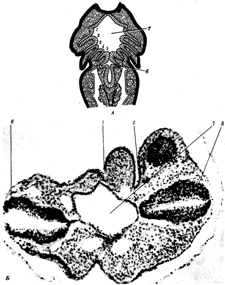 Рис. 14.22. Закладка жаберных щелей у позвоночных. А— фронтальный срез личинки тритона; Б— срез через глотку зародыша мыши (головной конец зародыша сильно изогнут, поэтому на фотографии видны два среза одной нервной трубки): 1—5— жаберные карманы и жаберные щели, 6— зачаток легкого, 7—полость глотки, 8— нервная трубка Date: 2015-04-23; view: 1402; Нарушение авторских прав |