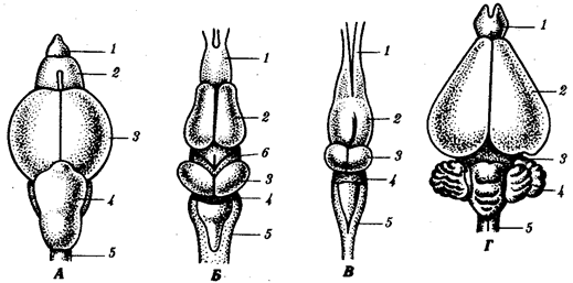 Рис. 14.39. Эволюция головного мозга позвоночных. А—рыба; Б— земноводное; В— пресмыкающееся; Г— млекопитающее: 1 —обонятельные доли, 2— передний мозг, 3— средний мозг, 4— мозжечок, 5— продолговатый мозг, 6— промежуточный мозг