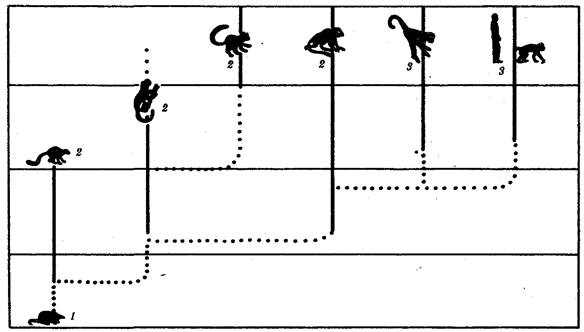 Рис. 15.1. Место человека в отряде приматов: 1 —предок приматов, 2— вымершие и современные полуобезьяны, 3— настоящие обезьяны Нового, Старого света и человек С биологических позиций важно ответить на вопрос: почему человек возник именно в отряде приматов, а не в другом эволюционно прогрессивном отряде млекопитающих. Ключевой адаптацией представителей отряда приматов являются древесный образ жизни и передвижение по ветвям с помощью хватательных конечностей, имеющих противопоставленный большой палец и уплощенные ногти вместо когтей. Пальцевые подушечки и внутренние поверхности кистей и стоп имеют кожные узоры в виде гребешков и бороздок, увеличивающих контакт пальцев с ветками и усиливающих их тактильную чувствительность. Локтевая кость свободно вращается вокруг лучевой. Эти особенности при освобождении рук от участия в движении являлись предпосылкой к использованию их в трудовой деятельности. Другими прогрессивными чертами приматов, связанными с энергичными перемещениями в трехмерном пространстве, являются бинокулярное зрение, сильно развитые мозжечок и кора больших полушарий головного мозга. В отличие от большинства отрядов млекопитающих приматов характеризует также выраженная социальность: жизнь небольшими стадами со сложной системой иерархии и общественным воспитанием потомства. Плодовитость приматов чрезвычайно низка — обычно рождается один детеныш, беспомощный и нуждающийся в уходе на протяжении многих лет. Характерной особенностью поведения приматов является выраженный инстинкт подражания, обеспечивающий быстрое научение и возможность передачи социального опыта в ряду поколений. Перечисленные черты отряда приматов явились необходимыми преадаптациями к возникновению человека при появлении комплекса благоприятных условий.