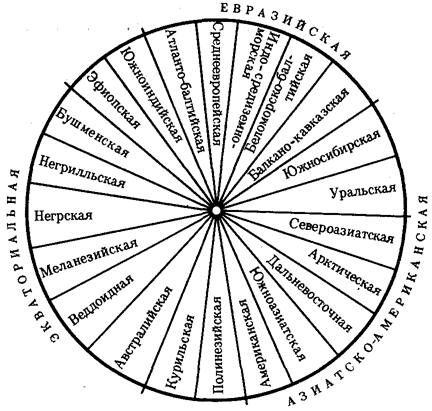 На протяжении длительного времени в антропологии господствовали представления о значимости расовой дифференцировки человечества и о большой роли естественного отбора в формировании основных расовых признаков. Применение методов молекулярной антропологии в значительной степени изменило представление о расах и расогенезе. Морфологические и в меньшей степени физиологические признаки дают возможность выделить внутри человечества три основные большие расы: европеидную, австрало-негроидную и монголоидную. Европеоиды имеют светлую или смуглую кожу, прямые или волнистые волосы, узкий выступающий нос, тонкие губы и развитый волосяной покров на лице и теле. У монголоидов кожа также может быть как светлой, так и темной, волосы обычно прямые, жесткие, темно пигментированные, косой разрез глаз и эпикант («третье веко»). Негроиды характеризуются темной кожей, курчавыми или волнистыми волосами, толстыми губами и широким, слегка выступающим носом. Имеются отличия рас и по некоторым физиологическим и биохимическим показателям: интенсивность потоотделения с единицы площади кожи у негроидов выше, чем у европеоидов, средние показатели уровня холестерина в плазме крови наиболее велики у европеоидов. В рамках каждой большой расы выделяются отдельные антропологические типы с устойчивыми комплексами признаков, называющиеся малыми расами. Существует три основных подхода к классификации рас: без учета их происхождения, с учетом происхождения и родства и на основе популяционной концепции. В соответствии с первым подходом три большие расы включают в себя 22 малые, причем между большими расами располагаются по две переходные малые. Схема расовой классификации изображается при этом в виде круга (рис. 15.7). Несмотря на то что при такой классификации не учитывается происхождение рас, само существование малых переходных рас, сочетающих в себе одновременно признаки двух больших рас (эфиопская, южносибирская, уральская и т.д.), свидетельствует, с одной стороны, о динамизме расовых комплексов признаков, а с другой — об условности членения человечества даже на большие расы. Гибридизация ДНК между большими выборками представителей малых рас в рамках одной большой показала высокую степень гомологии нуклеотидных последовательностей. Гибридизация ДНК представителей пар разных больших рас выявляет их значительную отдаленность друг от друга. Изучение гомологии нуклеотидных последовательностей западных европеоидов и представителей малой уральской расы и центрально-азиатских монголоидов с той же самой уральской расой дает среднее значение. Эти данные свидетельствуют о том, что переходные малые расы совмещают в себе не только морфологические признаки в соответствии с их промежуточным положением, но оказываются промежуточными и в отношении генетическом. Из этого следует, что они либо гибридогенны, либо сохранили в своей организации более древние черты, характерные для этапа существования человечества, предшествующего формированию больших рас.